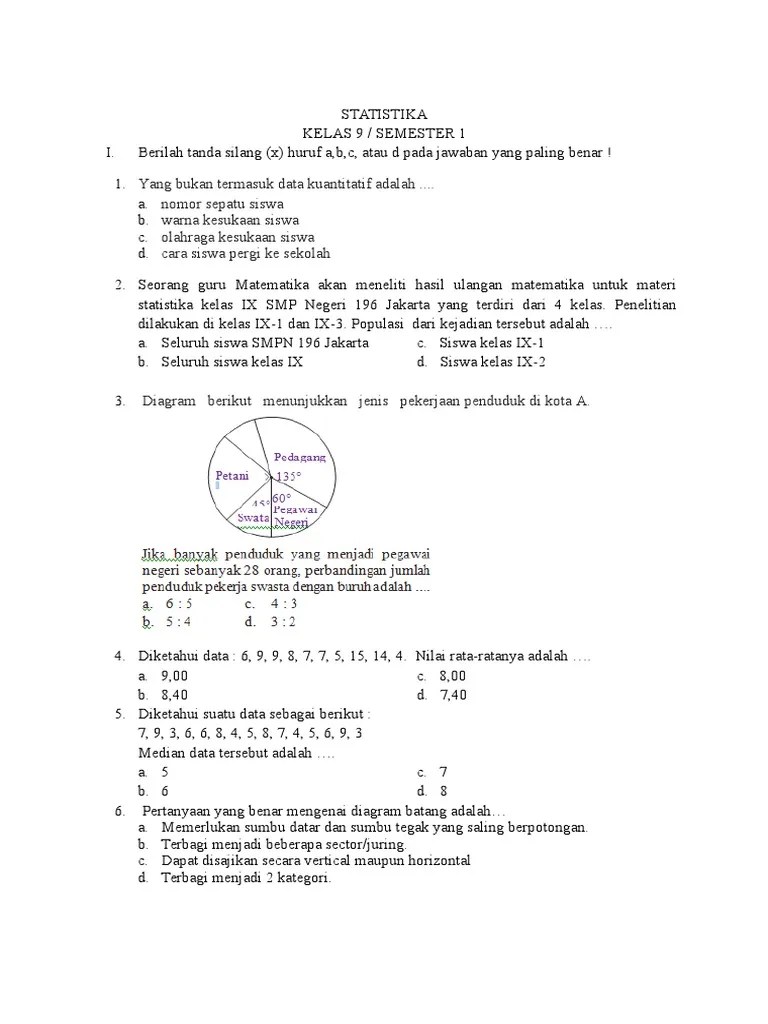 Soal Essay Statistika Kelas 8 Lukisan from imgv2-1-f.scribdassets.com Pilihlah salah satu jawaban yang benar dari pilihan jawaban yang tersedia! Jika setiap data dikurangi dengan a kemudian hasilnya dibagi dengan b ternyata menghasilkan data baru. Soal peluang kelas 8 smp. Sehingga nilai modus dapat kita cari: Ideologi berasal dari kata ideas dan logos, yang berasal dari bahasa. Soal dan pembahasan matematika smp/mts bab aritmatika sosial. Sebagai guru yang mengetahui hal tersebut, apa yang akan anda lakukan? Berilah tanda silang (x) pada huruf a, b, c atau d di depan jawaban yang paling benar !